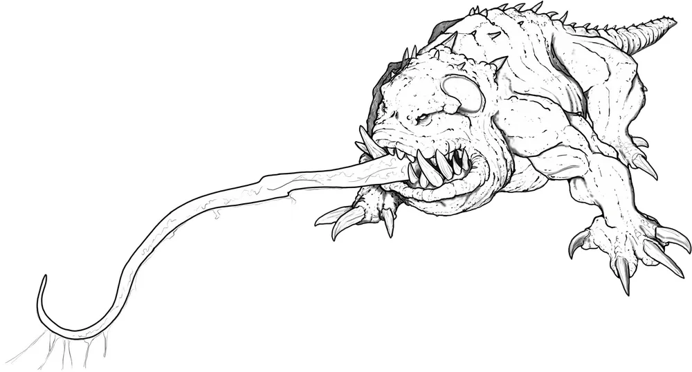 Equipment: The Steel Gulpa is armed with a whip-like tongue, corrosive juices, metal chomping teeth, and a few claws to match (all hitting at User Strength). Its thick hide confers a 5+ save.