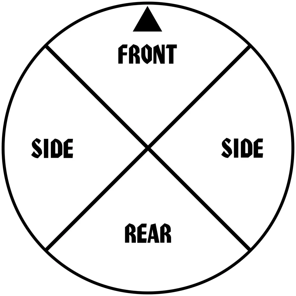Some Gubbinz have the stipulation that they can only be mounted in certain places. The sides are the usual vehicle quadrants, as seen in this diagram. These are not “slots” - mounting something on the left side does not mean another piece of Gubbinz can’t be mounted on the Vehicle’s left side. Between games you may move Gubbinz between quadrants, assuming where you’re moving them to is a legal location as described in their rules. No sneakily trying to move things to places they weren’t intended!