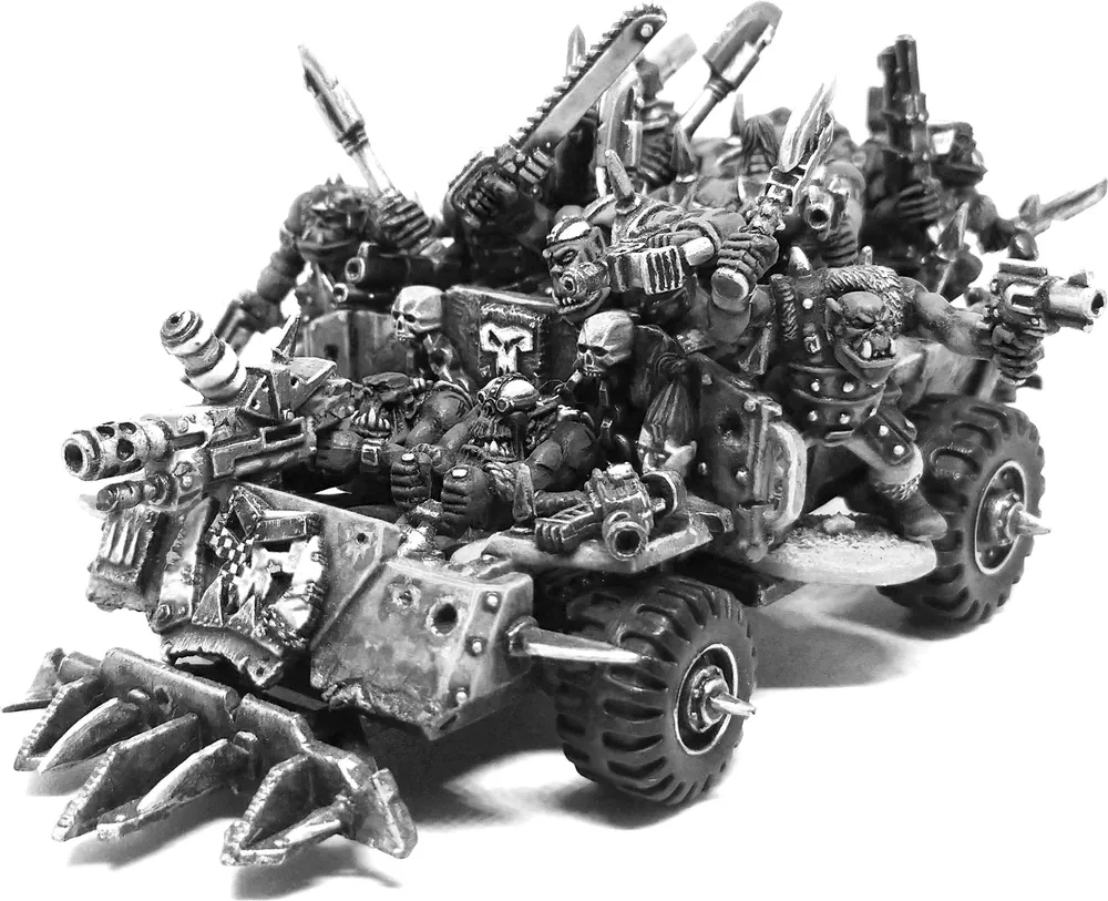 The attackers (da ambushers!) use their whole mob, and secretly split it into two parts. One part consists purely of Warriors who will be revealed on the board using the ‘Hidden Deployment’ and ‘Springin da Trap’ special rules below. The other is held off the board as reinforcements and is further divided into groups. Each group consists of one Vehicle, its Driver and Gunner if any, and as many Warriors as you want or can fit onto the Vehicle. Factions that don’t use Vehicles follow the same rules with the caveat that their reinforcements should arrive as a single group (up to 4” between models).