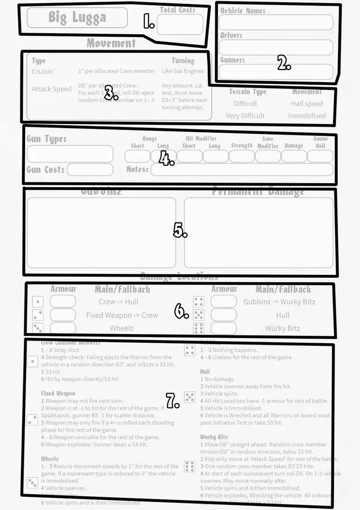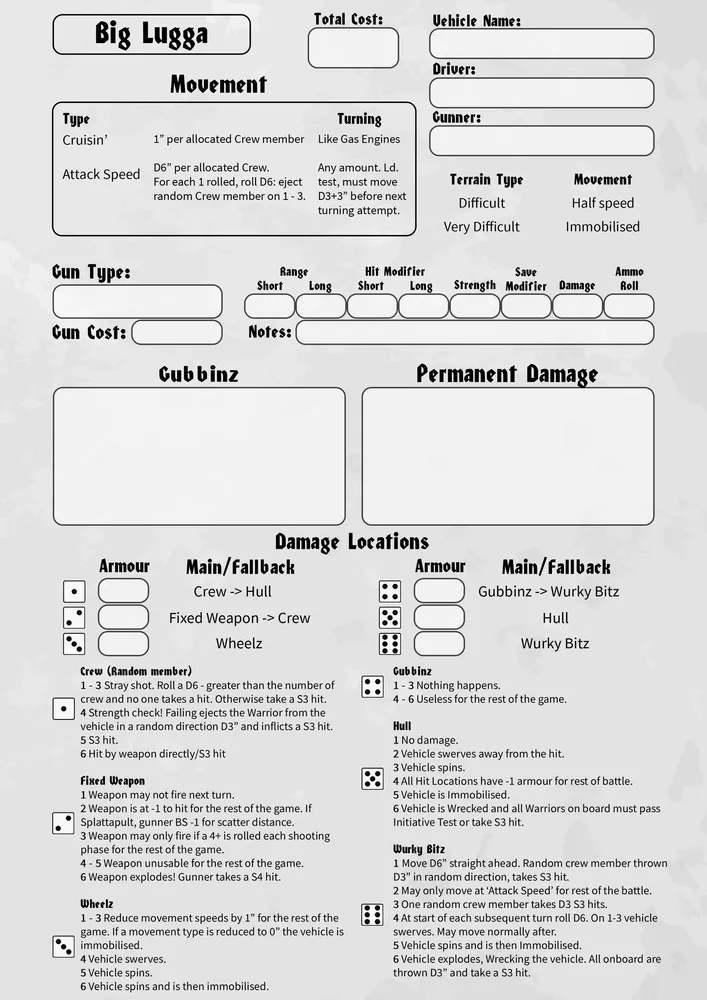Each vehicle must also have an assigned Driver and Gunner (where applicable). This assignment cannot be changed without engaging in a Bar Brawl (detailed in the ‘A Radical Life’ section below). Drivers and Gunners do not have to be Grots - the roles are normally held by Grots but if your mob is a bit weird that’s okay.