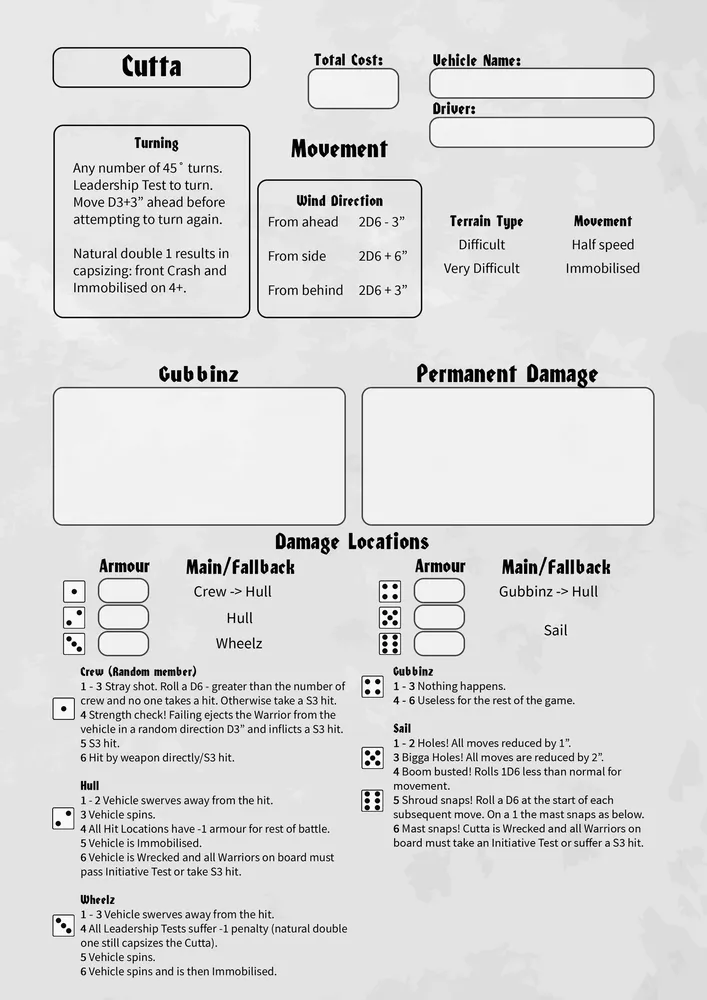 - Grot Cuttas now move 2D6+6 when the wind is from the side, and 2D6+3 when from behind. This is the reverse of the original method, but is more reflective of sailing physics, and gives the Cuttas a small boost in average speed overall.