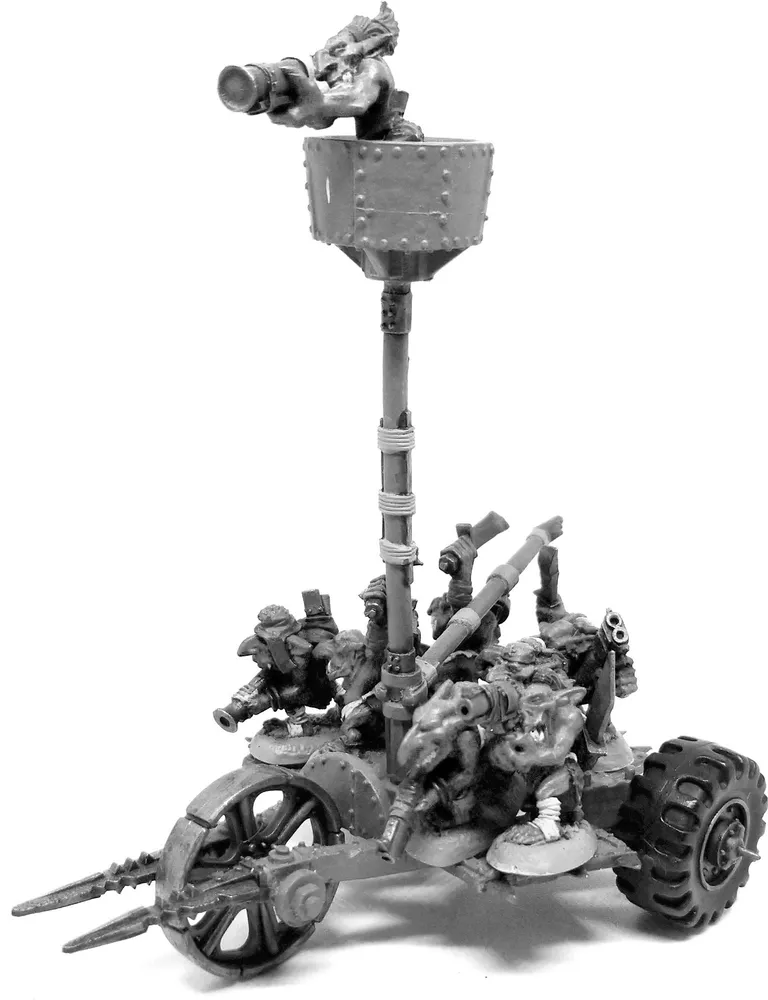 These are the Rebel Grots' main vehicles, and can often be big enough to carry whole mobs. They derive their power from the crew aboard via a range of ingenious and undoubtedly dangerous means, including pedals, pumps, and cranks turning huge fans, belts, shafts or even the wheels directly. This means in practice that the more crew set to work powering the Lugga, the faster it will (generally) go. These are also the only Grot vehicles sturdy enough to have Fixed Weapons mounted on them and are generally used to chase down Ork vehicles and overwhelm them with a green tide in daring boarding actions. In game terms they should be modelled to physically accommodate a good number of the models in the mob. Whilst a bigger vehicle might sound like a good idea in theory, you’ll find that they’re a lot harder to steer around obstacles - and template weapons affect them much more.
